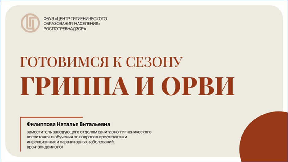 18 сентября 2024 года специалисты ФБУЗ «Центр гигиенического образования населения» Роспотребнадзора Буркова Елена Владимировна и Филиппова Наталья Витальевна провели вебинар «Детские сады и присмотр и уход за детьми» и «Готовимся к сезону гриппа и ОРВИ».