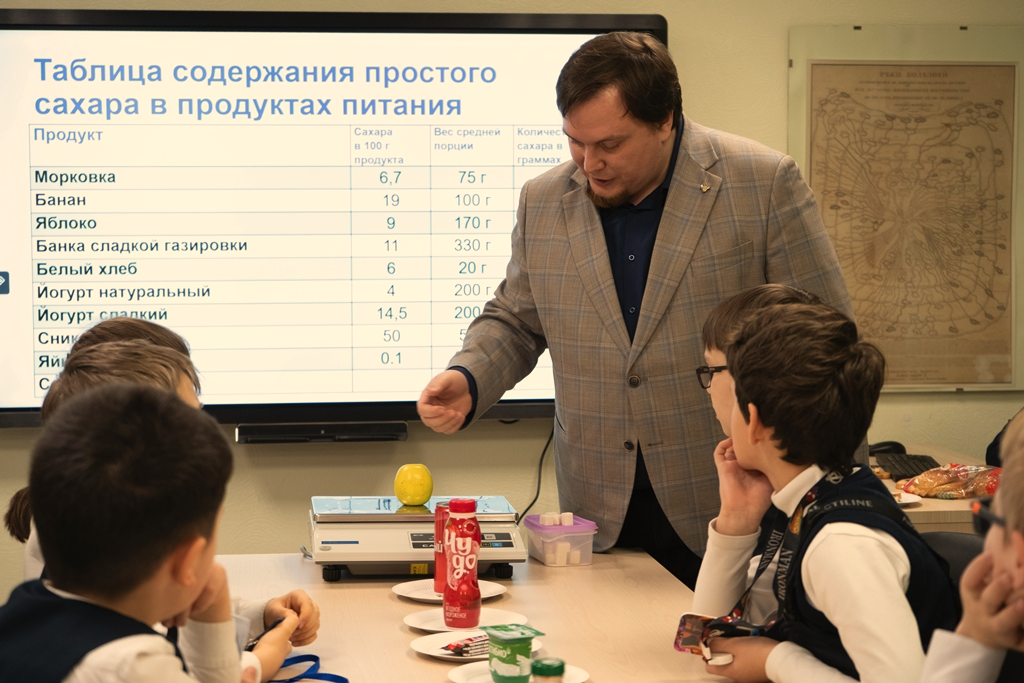 На станции «Сахарная» заведующий отделением санитарно-гигиенического воспитания и обучения по вопросам здорового питания А.А. Гаврилин вместе с детьми искали скрытый сахар в различных продуктах питания. Работая с таблицами и измерительными приборами, ученики смогли опытным путем узнать, какое количество сахарных кубиков содержится в тех или иных продуктах, которые часто используются для перекуса.