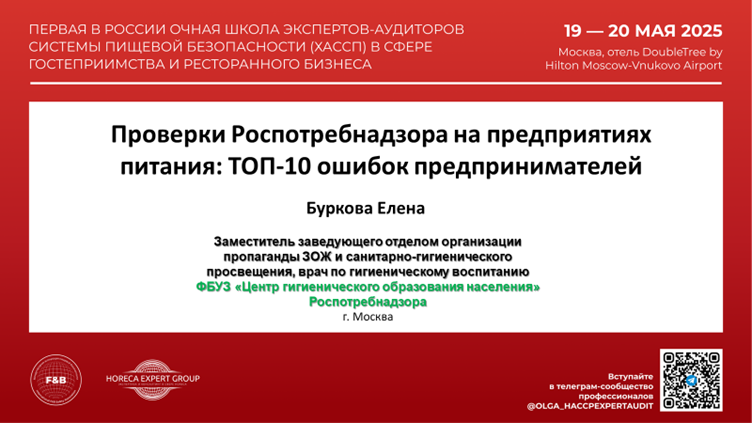 20 мая 2025 года года специалист ФБУЗ «Центр Гигиенического образования населения» Роспотребнадзора, Буркова Е.В. приняла участие работе первой в России очной школы экспертов-аудиторов системы ХАССП (авторский практический курс Ольги Пасько).