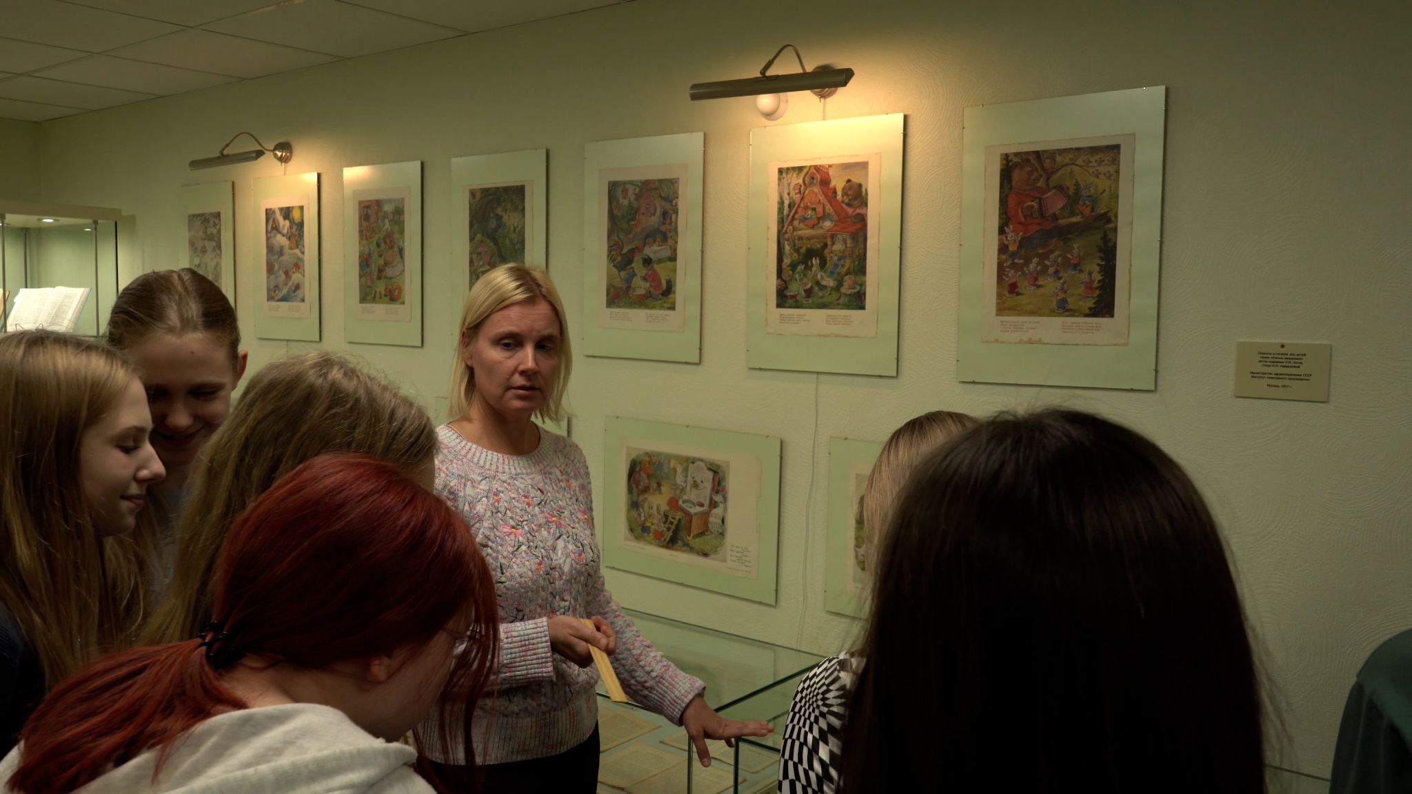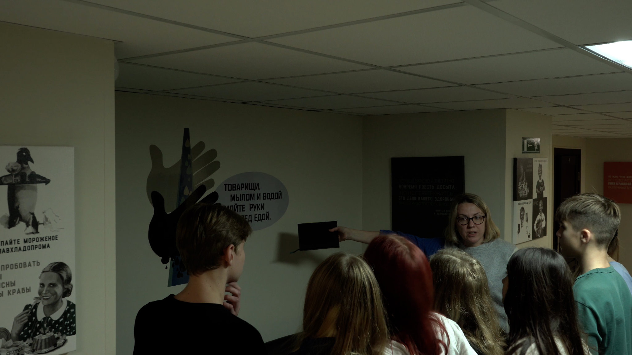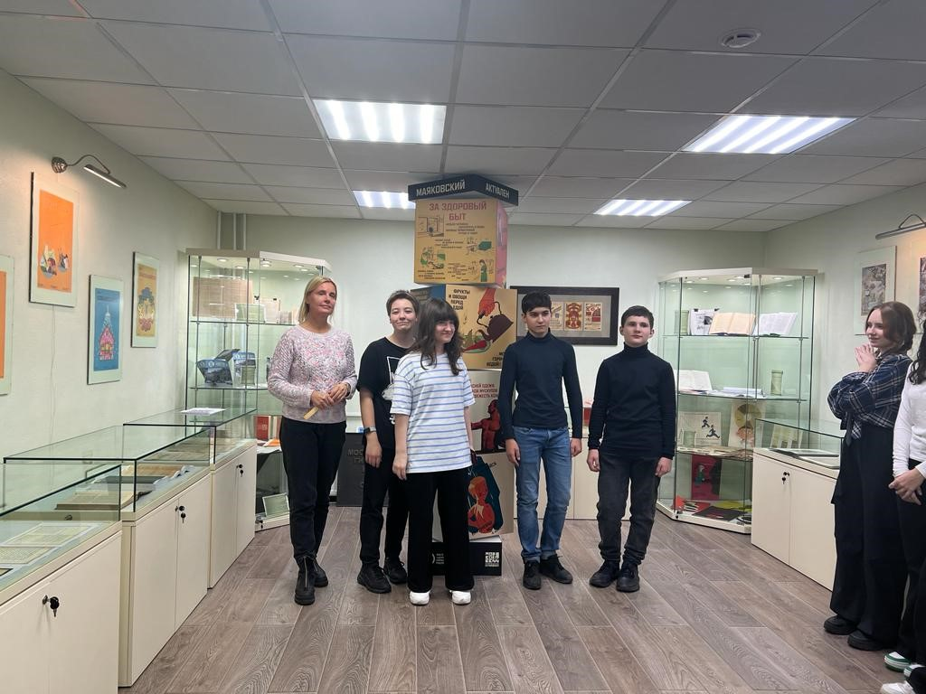 Врач-методист Анастасия Владимировна Шалунова провела экскурсию в зале выставочной экспозиции на тему «По страницам истории санитарного просвещения». На выставке учащимся показали уникальные материалы: книги, газеты, плакаты, листовки «Витамины на страже здоровья советского человека» 1945 года, инсталляцию из экспонатов-плакатов Государственного музея В.В. Маяковского в рамках темы «Вопросы гигиены в творчестве В.Маяковского», фотоматериалы, пластинки 1941 года, с записью санитарно-просветительных лекций по гигиене и охране здоровья, озвученные известным советским диктором Ю.Б. Левитаном. Анастасия Владимировна рассказала о деятельности Московского городского дома санитарного просвещения (ныне ФБУЗ «Центр гигиенического образования населения» Роспотребнадзора) и Центрального научно-исследовательского института санитарного просвещения. Учащиеся ознакомились с брошюрами крестьянской библиотеки «Здоровая деревня», а также с санитарно-просветительными материалами на тему «Охрана материнства и детства», серией плакатов «Умные зверюшки» и другими материалами.