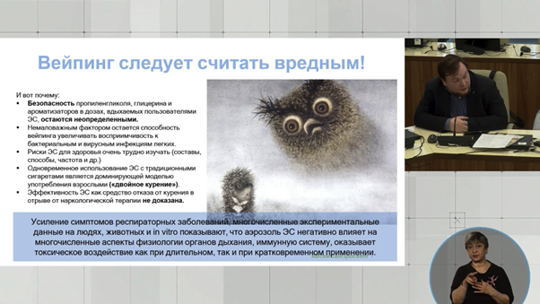 Несмотря на то, что юридически вейпинг приравнивается к устройствам для потребелния никотина (даже в том случае, когда картридж устройства и вдыхаемый аэрозоль его не содержит), вейпинг все еще имеет высокое распространение среди молодежи. Одной из главных причин этого считается широкое распространение заблуждений касательно «безопасности» данной привычки. В своем выступлении мы отразили имеющиеся на сегодня медицинские факты, которые развенчивают эти мифы и указывают на дейтсвительну угрозу здоровью, особенно для дыхательной системы, со стороны вейпинга.