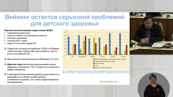 26 февраля 2025 года ФБУЗ «Центр гигиенического образования населения» Роспотребнадзора принял участие в тематическом общегородском онлайн совещании Экспертно-консультативного совета родительской общественности (ЭКСРО) при Департаменте образования и науки города Москвы. Заведующий отделением санитарно-гигиенического воспитания и обучения по вопросам здорового питания Александр Александрович Гаврилин выступил с докладом о вреде вейпинга и электронных сигарет.