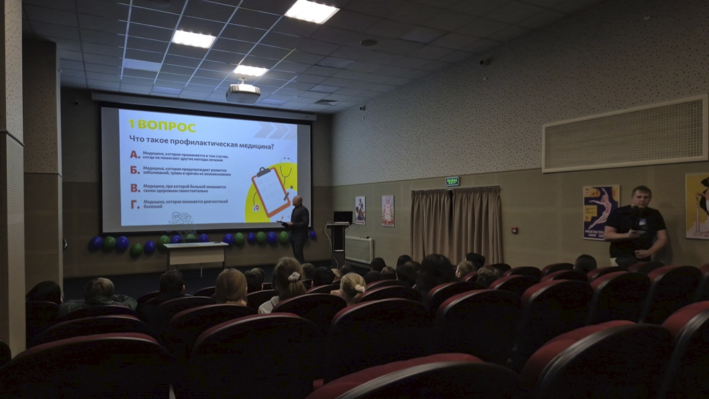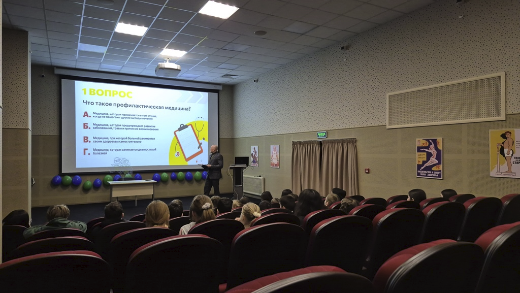 Денис Алексеевич Делицын, врач по гигиеническому воспитанию, провел интерактивный урок в формате квиза на тему “Здоровье и выбор профессии”, целью которого было заинтересовать и рассказать детям о профилактическом направлении в здравоохранении.