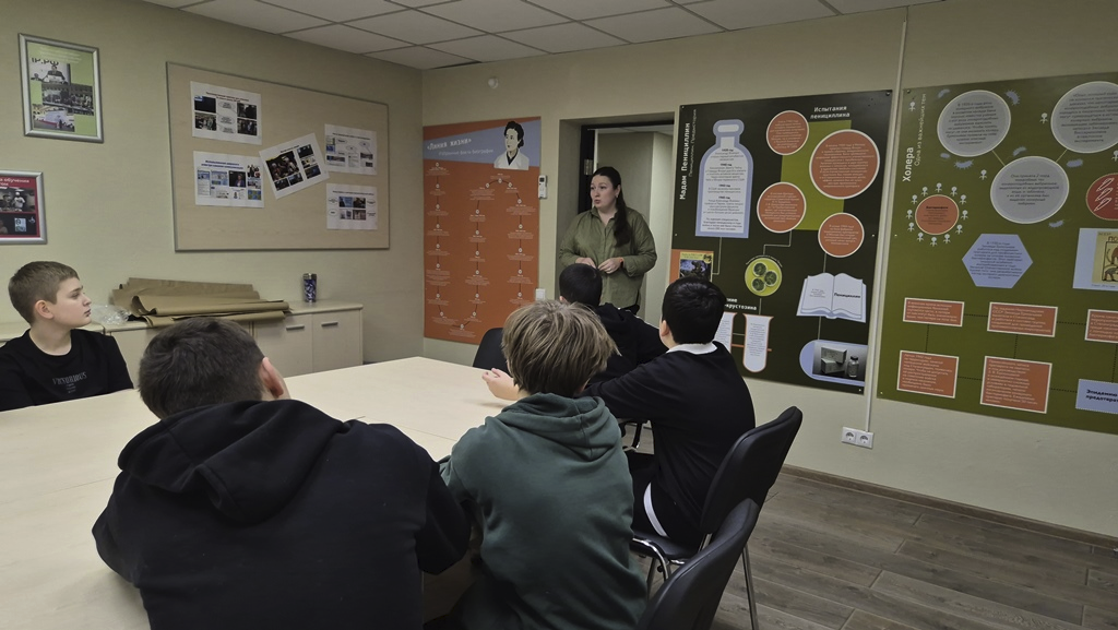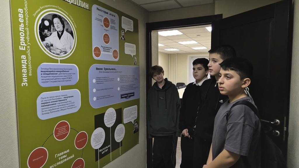 Ирина Андреевна Гаранина, врач-эпидемиолог, познакомила учащихся с материалами выставки «Мадам Пенициллин», посвященной научному подвигу З.В. Ермольевой во время Великой Отечественной войны. Ребята узнали, какими личностными и профессиональными качествами обладала Зинаида Виссарионовна, выдающийся врач-микробиолог, эпидемиолог: решительность, напористость, энтузиазм ученого, чувство долга и одновременно женская мягкость. Даже в оккупированном Сталинграде в годы войны, при обстрелах и бомбардировках, Зинаида Ермольева не обращала внимание на трудности. Она смогла создать лабораторию в полевых условиях, обучала и инструктировала медиков, санинспекторов и сандружинниц. Такие примеры самоотверженности и мужества врачей вдохновляют и подталкивают школьников к выбору этой профессии.