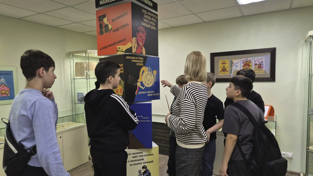 Также школьники ознакомились с инсталляцией, состоящей из экспонатов-плакатов Государственного музея В.В. Маяковского в рамках темы «Вопросы гигиены в творчестве В.В. Маяковского».
