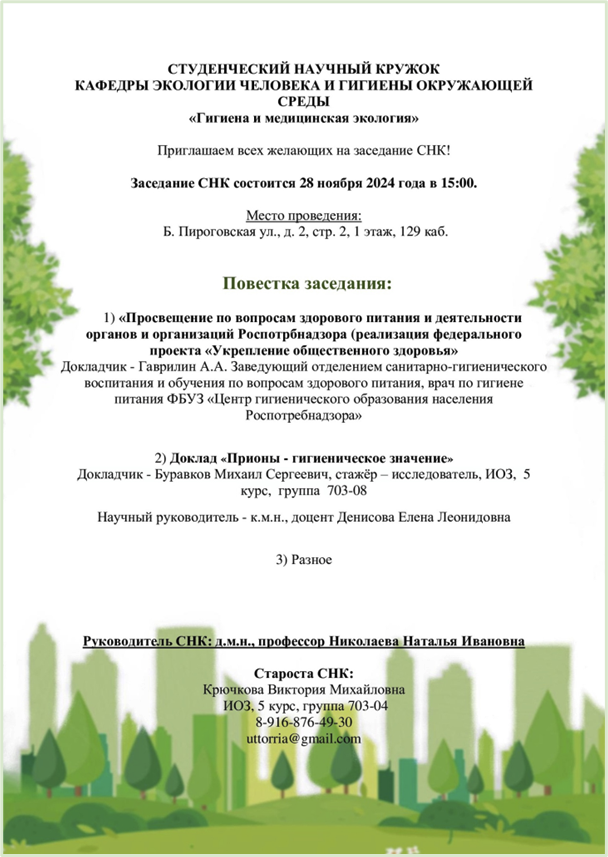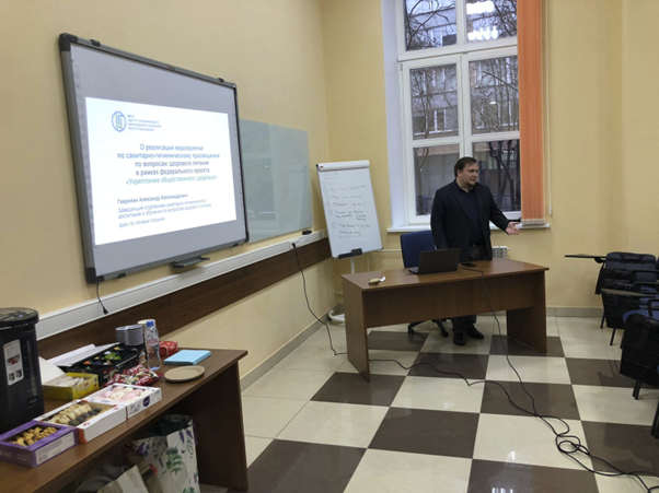 28 ноября 2024 года заведующий отделением санитарно-гигиенического воспитания и обучения по вопросам здорового питания Гаврилин Александр Александрович выступил перед участниками студенческого научного кружка по гигиене на кафедре экологии человека и гигиены окружающей среды Сеченовского университета с темой «О реализации мероприятий по санитарно-гигиеническому просвещению по вопросам здорового питания в рамках федерального проекта «Укрепление общественного здоровья».