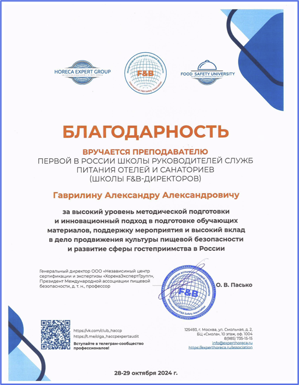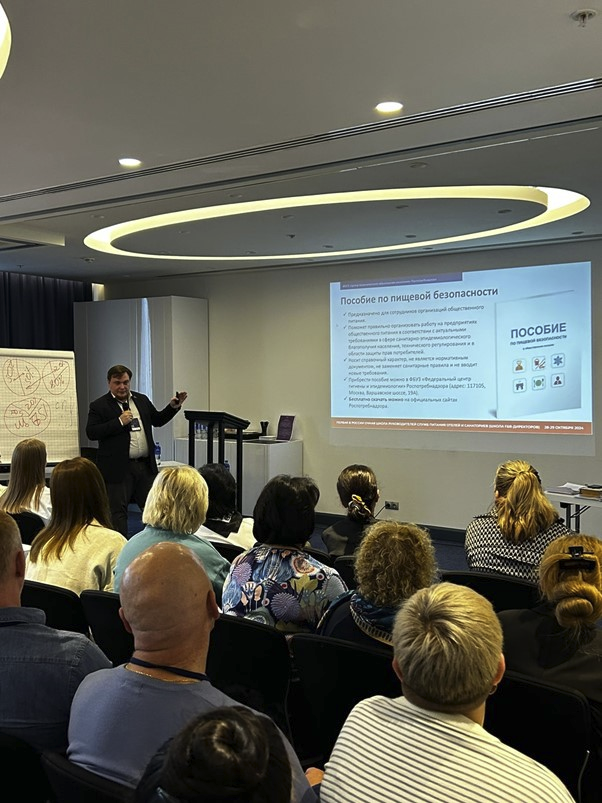 29 октября 2024 года заведующий отделением санитарно-гигиенического воспитания и обучения по вопросам здорового питания Александр Гаврилин принял участие в работе «Школы F&B-директоров» в секции, посвященной пошаговому внедрению системы пищевой безопасности в отеле и санатории.