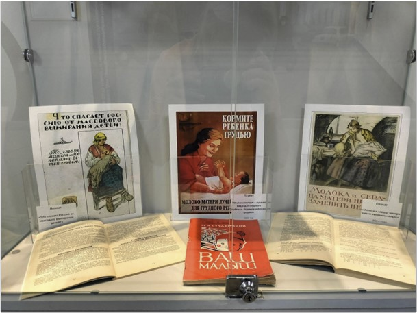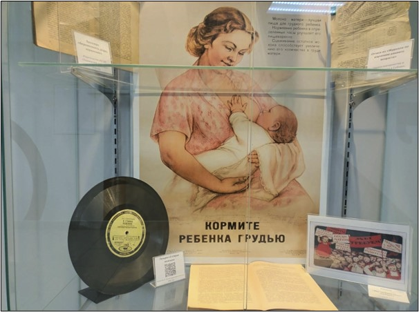 Выставочная экспозиция знакомит с историей работы Центра гигиенического образования населения, Института санитарного просвещения по распространению информации о грудном вскармливании и охране здоровья матери и ребенка. В витрине представлены тематические материалы, которые бережно хранит Центр: брошюры, буклеты, книги, памятки, плакаты и пластинки, посвященные данной теме.