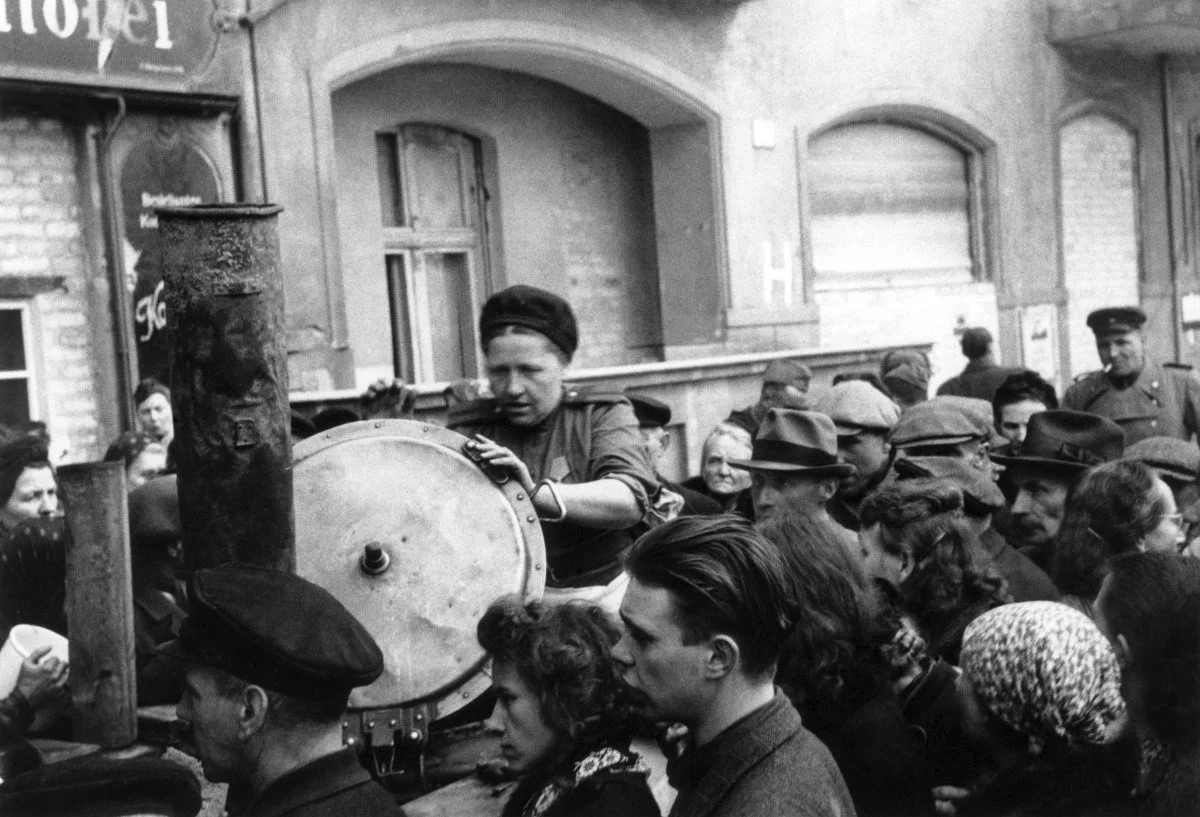 Мирные жители в очереди за едой у полевой кухни. Берлин 1945 г.