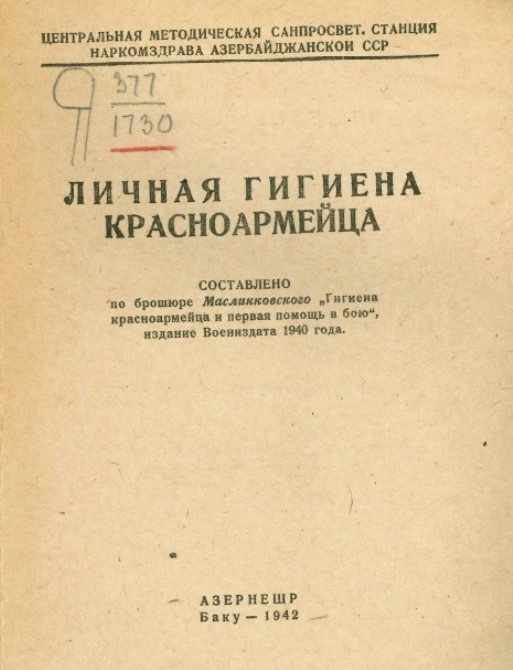 - «Личная гигиена красноармейца» Центр. метод. санпросвет. станция Наркомздрава АзССР. - Баку : Азернешр, 1942.