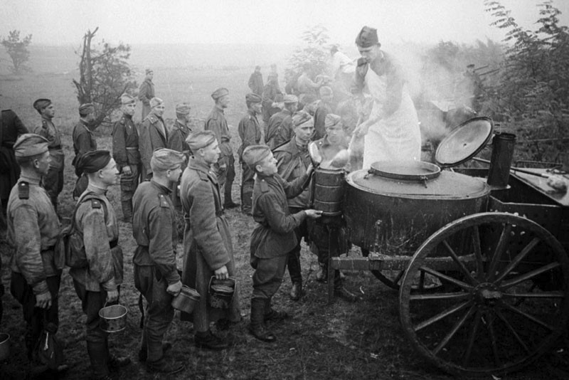 В годы Великой Отечественной войны красноармеец обязательно дважды в день получал горячую пищу, что было особенно важно в зимний период. Все продукты, кроме хлеба, советский солдат получал в горячем виде. Готовили на полевых кухнях простые, но сытные блюда: кулеш, щи, борщи, каши с мясом, тушеный картофель.