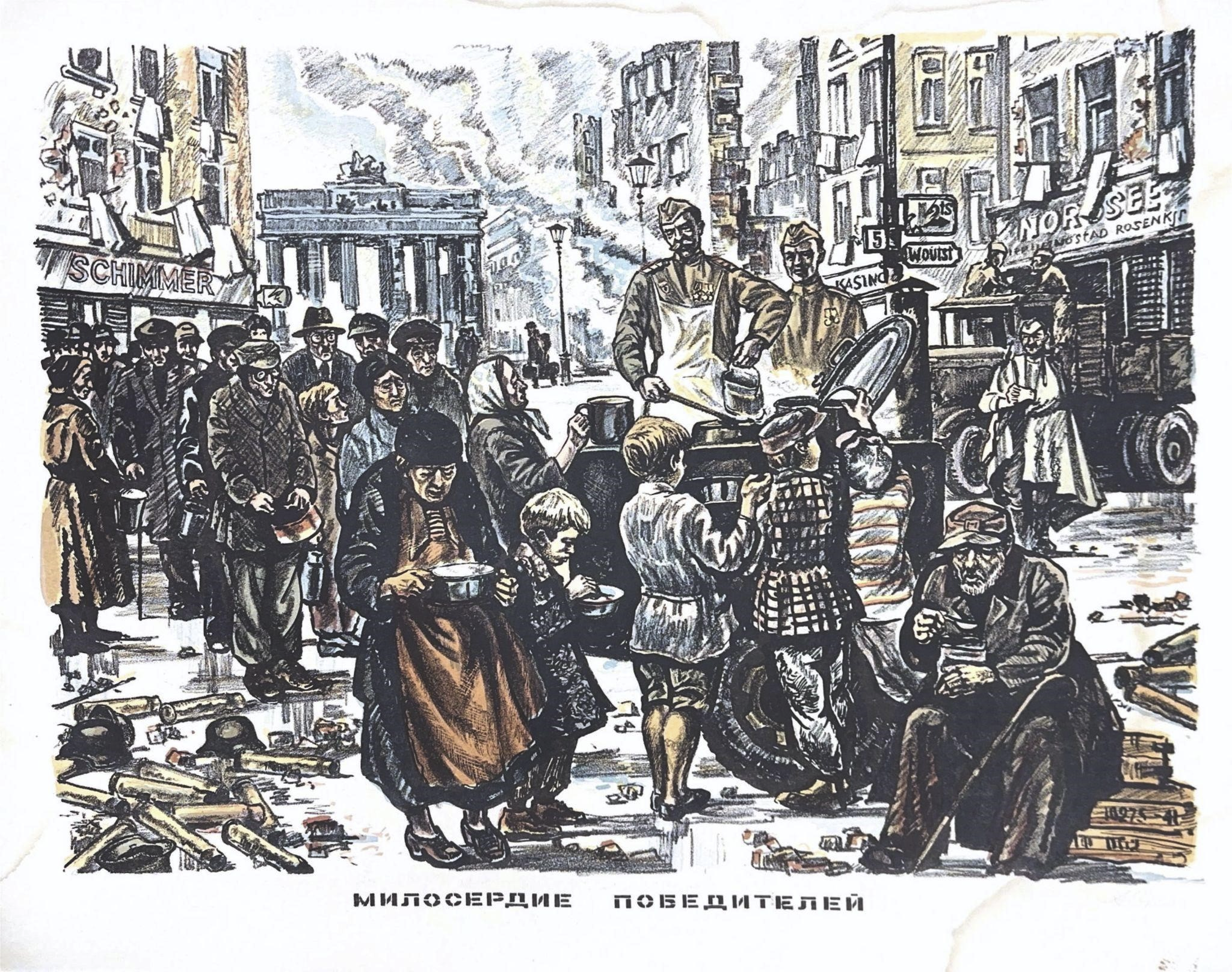 Еще по мере приближения к логову фашистского зверя, на освобожденных территориях советская армия брала на себя задачу кормить гражданское население. Для решения этого вопроса на помощь голодающим пришли полевые кухни. На разрушенных войной улицах к армейским кухням выстраивались очереди мирных жителей.