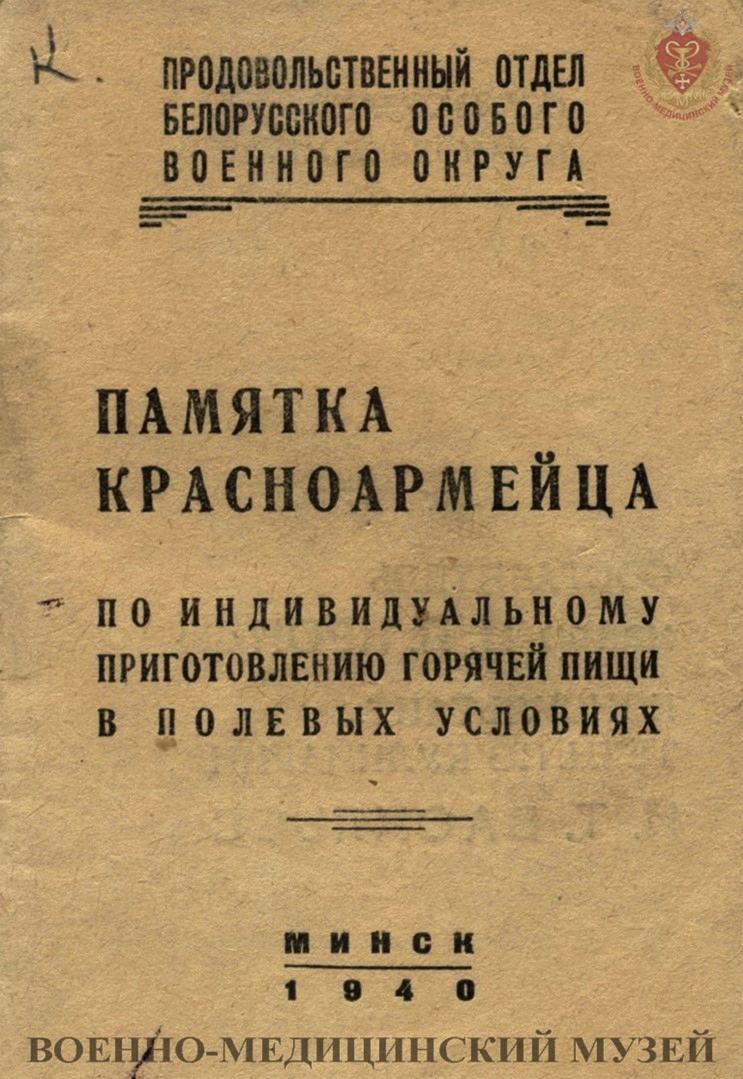 «Памятка красноармейца по индивидуальному приготовлению горячей пищи в полевых условиях» Продовольственный отдел Белорусского особого военного округа. «Кр. Правда» г. Минск 1940 г.