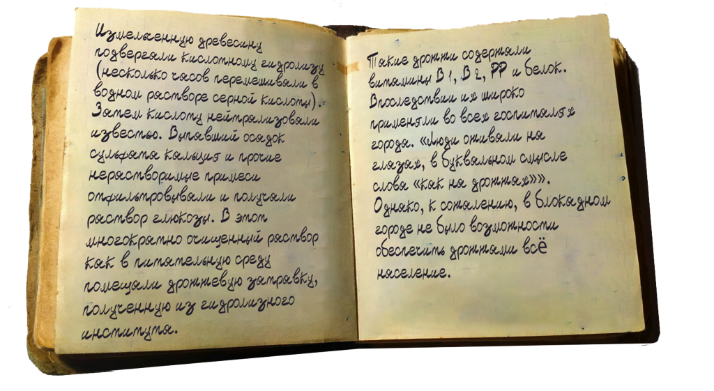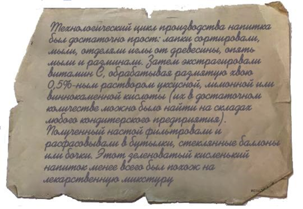 Как вспоминал после войны Алексей Дмитриевич Беззубов, во время блокады начальник химико-технологического отдела Всесоюзного НИИ витаминной промышленности и консультант санитарного управления Ленинградского фронта, разработчик технологии производства витаминного препарата на основе хвои, лауреат Сталинской премии: «Трудности заготовки хвои были колоссальные». «Слёз было в достатке – женщины приходили со стоптанными пятками… Позже организовали доставку на лошадях… И я вам должен сказать, что мы этот настой делали в таких количествах, что обеспечивали им все госпитали и столовые»…