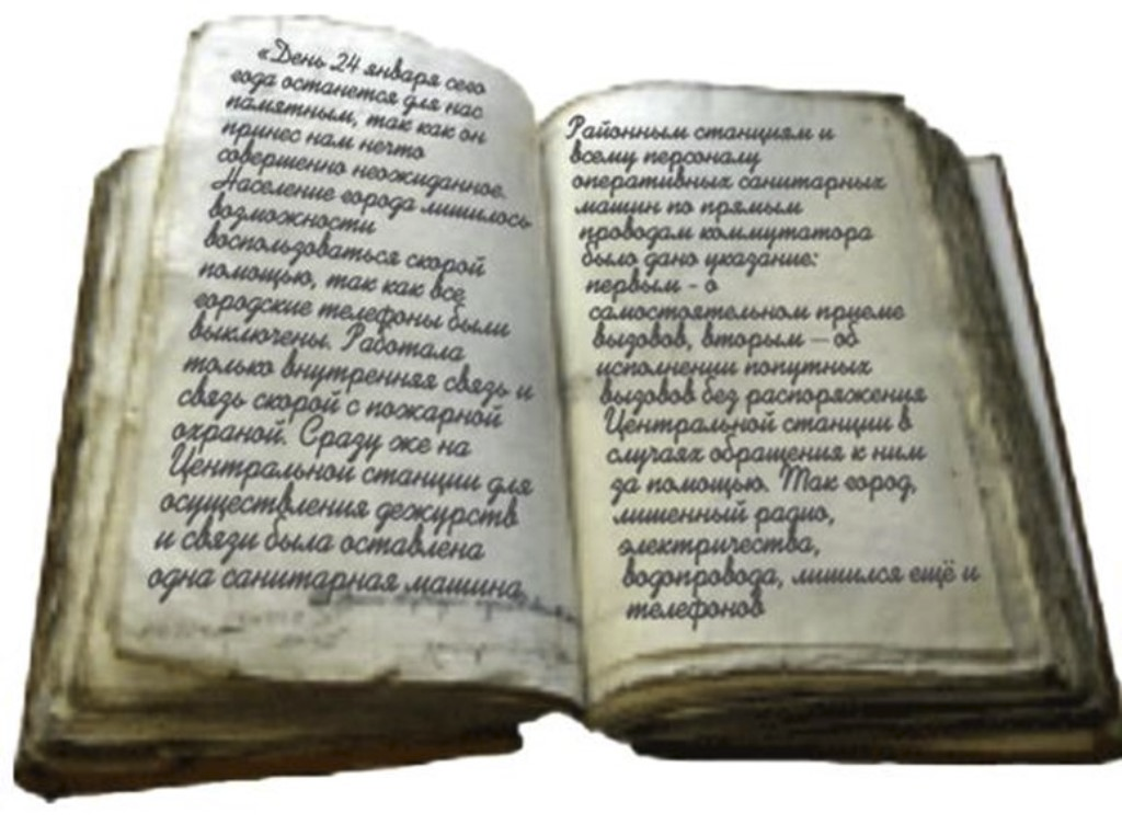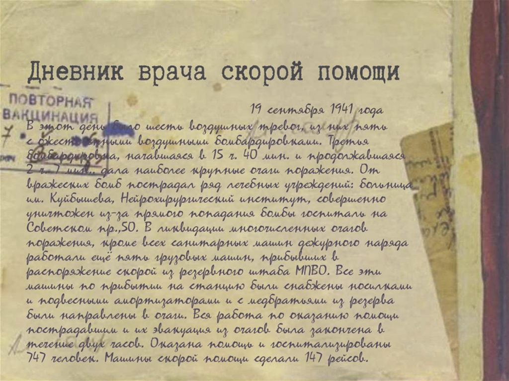 О работе скорой медицинской помощи в блокадном Ленинграде известно, к сожалению, очень мало. К началу войны в городе было 9 станций скорой помощи с 72 дежурными санитарными машинами, каждая машина – это бригада с двумя медбратьями. Врачей было всего 25. На фронт сразу же ушла четверть всего состава медбратьев – 89 из 352. На Городской станции скорой помощи сотрудники вели профессиональные дневники, в которых фиксировали всё происходящее в городе.