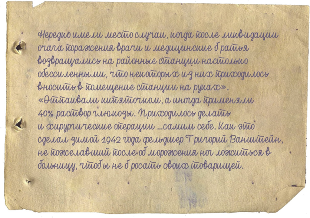 Истощенные, в неотапливаемых зданиях поликлиник, больниц и госпиталей, стены которых покрывал иней, они надевали белые халаты поверх ватников, заполняли карандашом истории болезни при свете коптилок (чернила застывали в чернильницах), лечили и тратили свои последние силы на то, чтобы выносить раненых из разбитых лечебных учреждений. Дети и взрослые, умирающие без еды и от ранений, сходящие с ума от голода, – медики блокадного города не оставляли без внимания никого из нуждающихся. За годы блокады они подняли на ноги десятки тысяч больных и раненых.