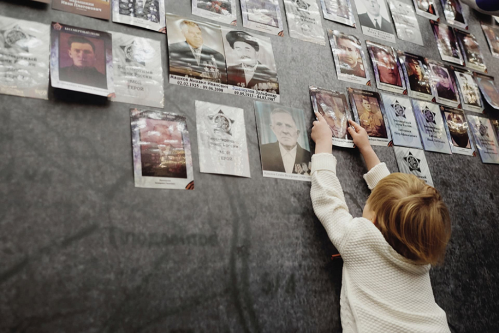 «Стена памяти» организуется на предприятиях, в учреждениях и школах. Там взрослые и дети размещают портреты своих родственников, участвовавших в Великой Отечественной войне.