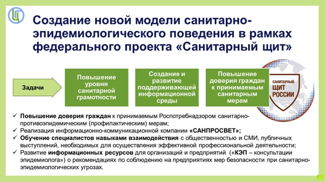 С 2021 года Роспотребнадзором реализуется федеральная программа «Санитарный щит страны – безопасность для здоровья (предупреждение, выявление, реагирование)», одним из направлений которой является повышение уровня санитарной грамотности людей. Для этих целей и задач осуществляется создание и развитие информационной среды, поддерживающей обеспеченность населения сведениями о мерах, направленных на предупреждение угроз биологической безопасности и реагирование на них. Разработана Коммуникационная стратегия «Санпросвет», целью которой является «перезагрузка» отношения населения к санитарно-эпидемиологическим мерам повышение уровня культуры населения и доверия граждан к принимаемым санитарно-эпидемиологическим мерам – формирование новой современной модели санитарно-эпидемиологического поведения, основанной на чувстве сопричастности и ответственности за индивидуальное и общественное здоровье, приверженности профилактическим мерам.