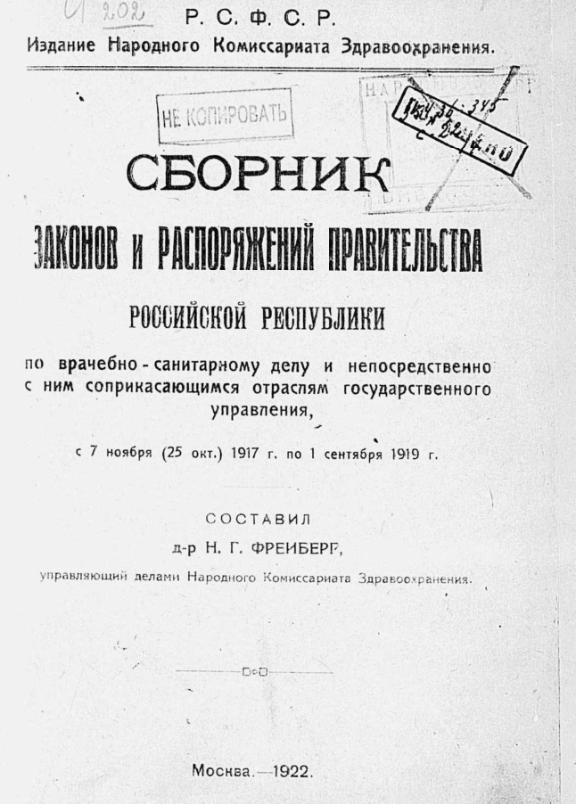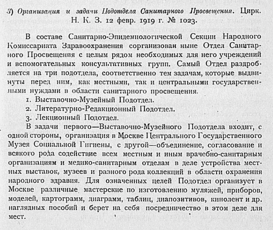 12 февраля 1919 года в Наркомздраве РСФСР, под руководством Н.А. Семашко и его заместителя З.П. Соловьева, был организован отдел санитарного просвещения в составе Санитарно-эпидемиологической секции с целым рядом необходимых для него учреждений и вспомогательных консультативных групп (циркуляр Наркомздрава РСФСР от 12 февраля 1919 года № 1023).