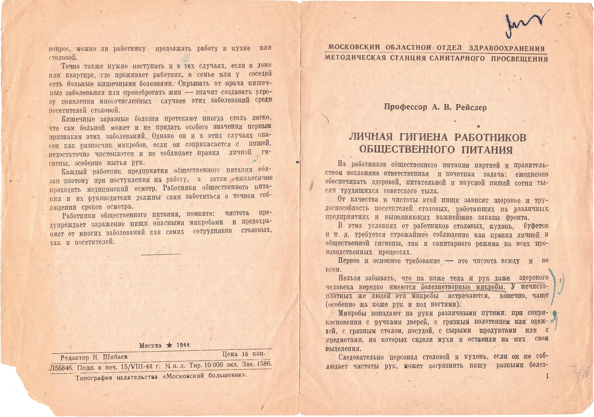 Уважаемые посетители сайта! Предлагаем вашему вниманию памятку профессора А.В. Рейслера «Личная гигиена работников общественного питания» 1944 года. В материале представлены рекомендации, которые предъявлялись к работникам общественного питания в области личной гигиены.