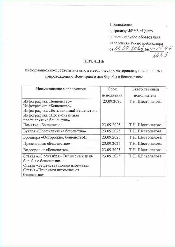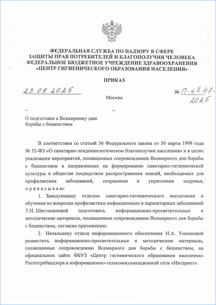 ФБУЗ «Центр гигиенического образования населения» Роспотребнадзора в целях оказания практической и методической помощи специалистам органов и организаций Роспотребнадзора и медицинских организаций в сфере организации и проведения информационно-разъяснительной работы среди населения по вопросам профилактики инфекционных заболеваний подготовил информационно-просветительные и методические материалы, посвященные сопровождению Всемирного дня борьбы с бешенством.