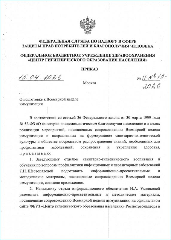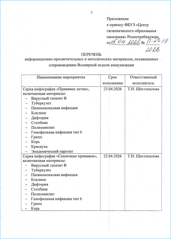 ФБУЗ «Центр гигиенического образования населения» Роспотребнадзора в целях оказания практической и методической помощи специалистам органов и организаций Роспотребнадзора и медицинских организаций в сфере организации и проведения информационно-разъяснительной работы среди населения по вопросам иммунопрофилактики вакциноуправляемых инфекций подготовил информационно-просветительные и методические материалы, посвященные сопровождению Всемирной недели иммунизации.